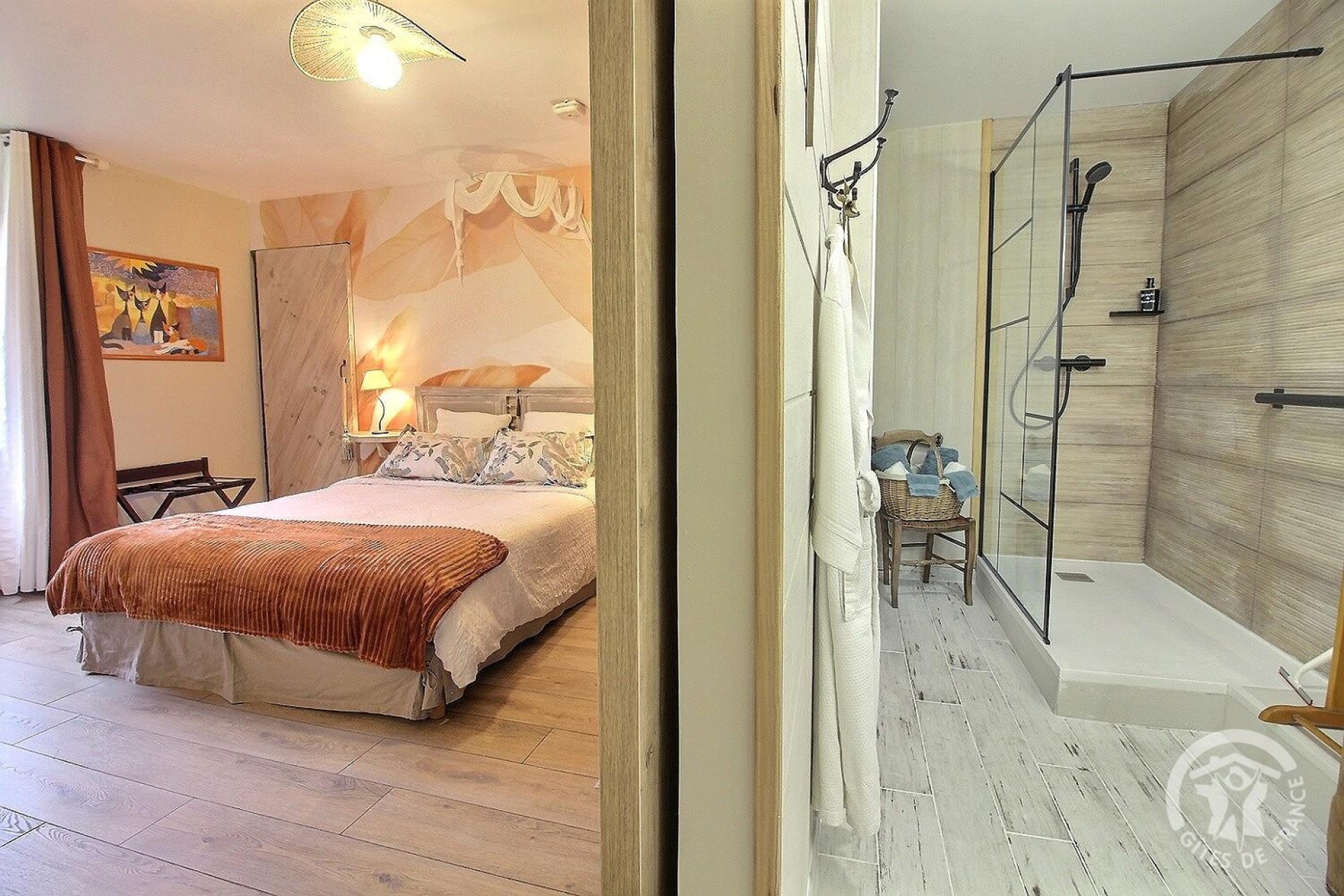 Indépendante et en annexe : Entrée rdc avec petit salon et ch à l'étage, 1 lit 180x190 (qui peut se dédoubler sur demande préalable), douche, wc privés.